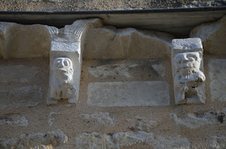 Bovenaan het portaal is een bandlijst ondersteund door 7 gebeeldhouwde modillons. De modillons stellen verschillende personages voor. Van links naar rechts ziet men een man met lange haren die Adam zou kunnen voorstellen, een kruis overdekt met een slang, een vrouw met de ogen bedekt van een doek die Eva zou kunnen voorstellen, een olifant ondersteund door een palmet en dragend een ronde toren met kantelen, een vrouw met uitpuilende ogen, een man die een lange snor draagt en een hybridisch gezicht van een half menselijk, half katachtig wezen. In hun geheel verhalen deze modillons de episode van de Eerste Zonde en de Zondeval.